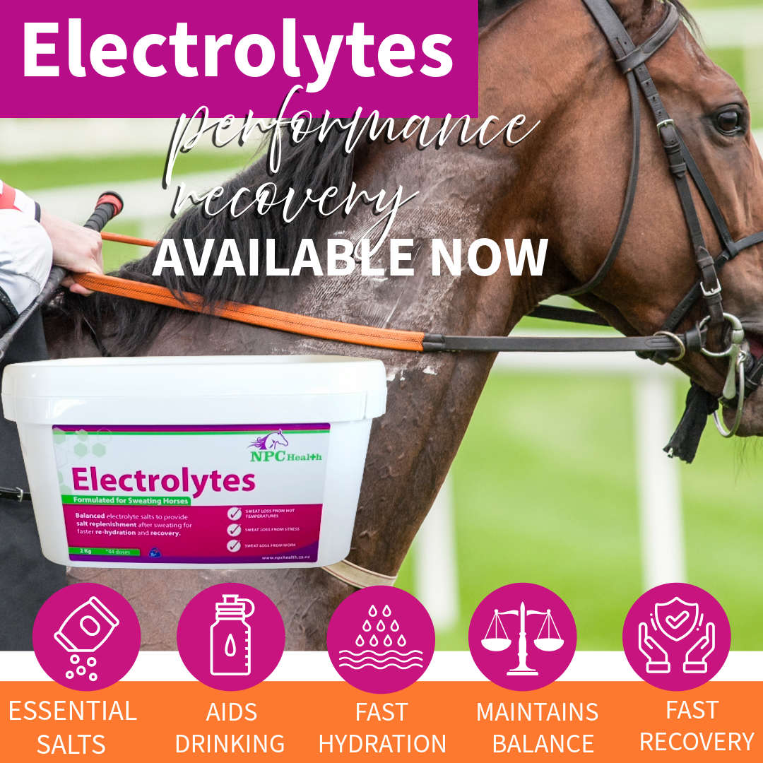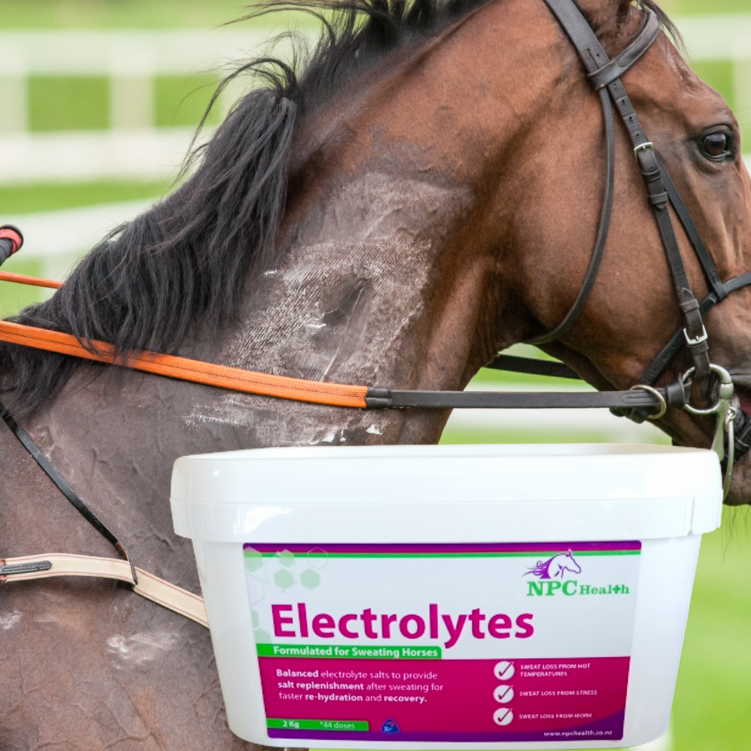 Electrolytes for horses consist of Sodium, Chloride, Potassium, Calcium and Magnesium. which are lost in sweat and should be replaced after sweating has taken place. By replenishing salts after sweating homeostasis (body balance) can be restored.